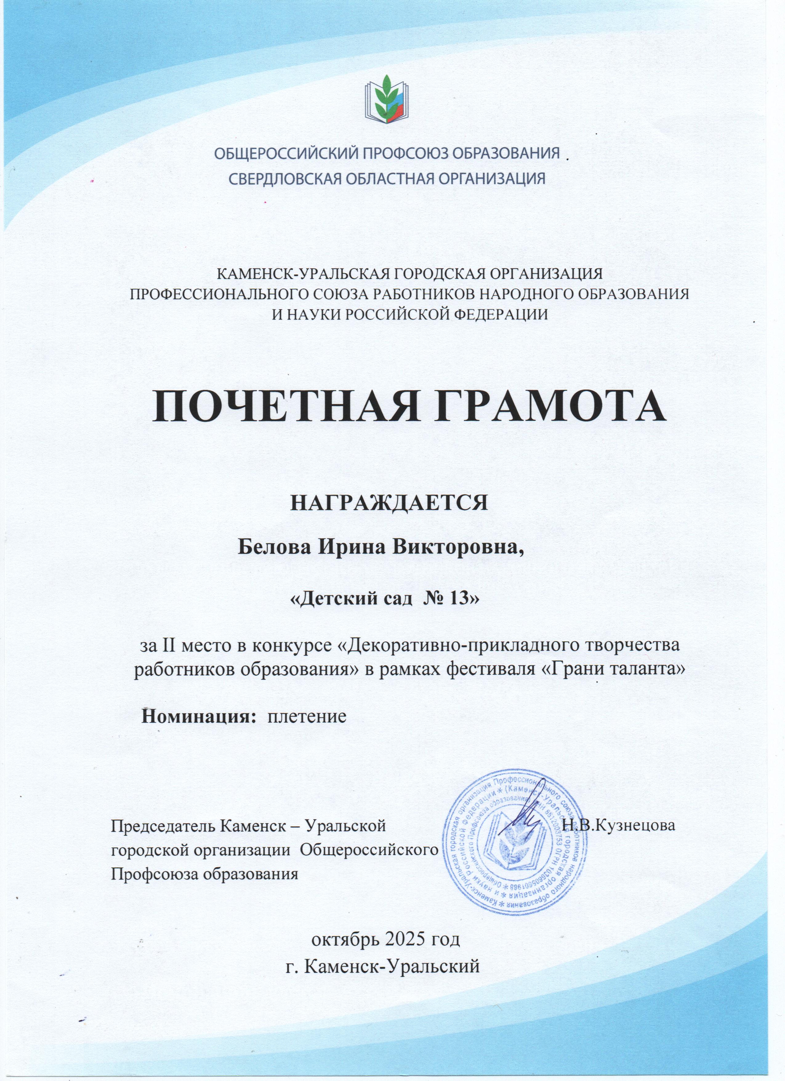За II место в конкурсе "Декоративно-прикладного творчества работников образования" в рамках фестиваля "Грани таланта"