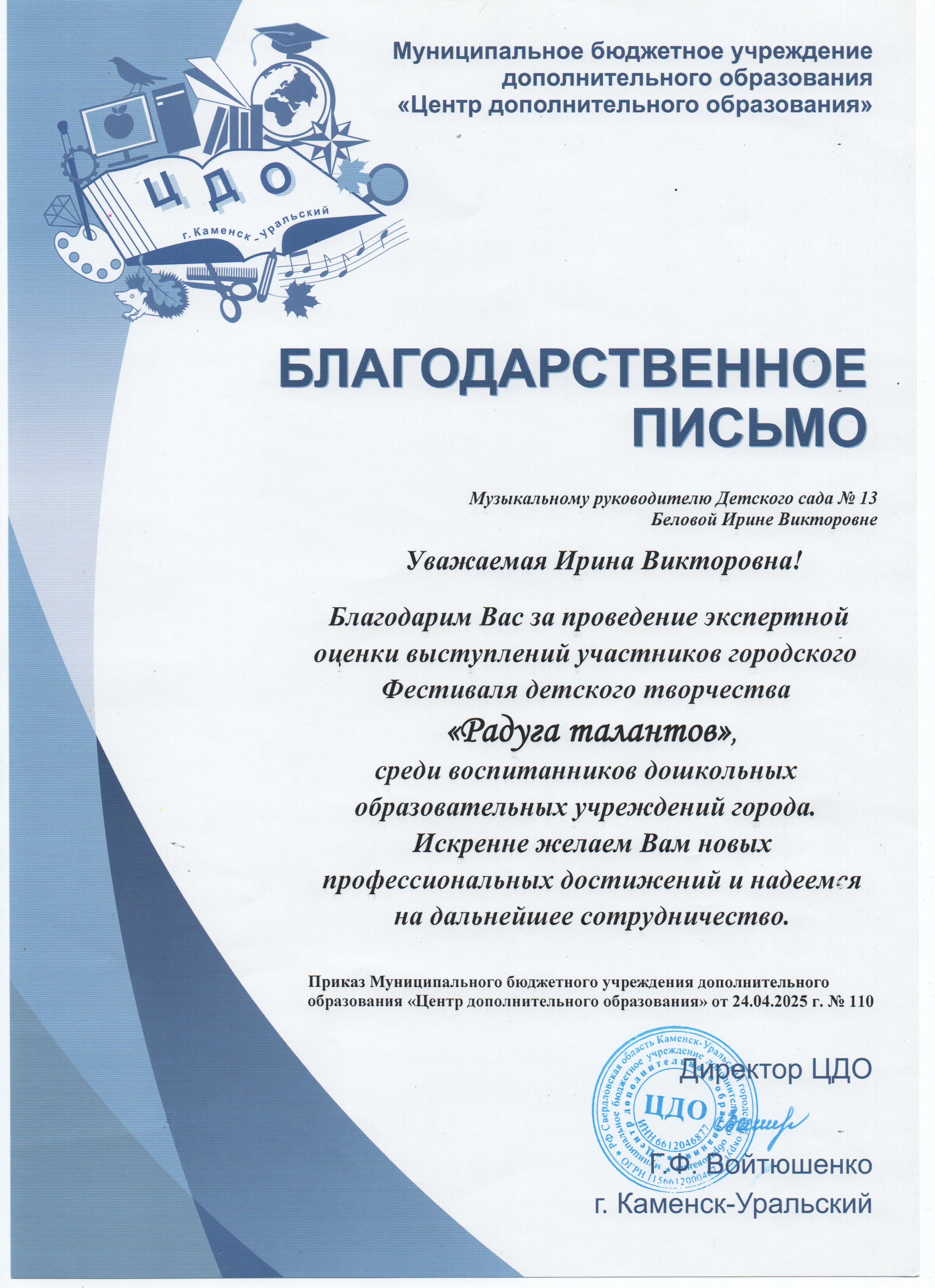 Благодарственное письмо за проведение экспертой оценки выступлений учасников городского фестиваля детского творчества "Радуга талантов" среди воспитанников дошкольных образовательных учреждений города