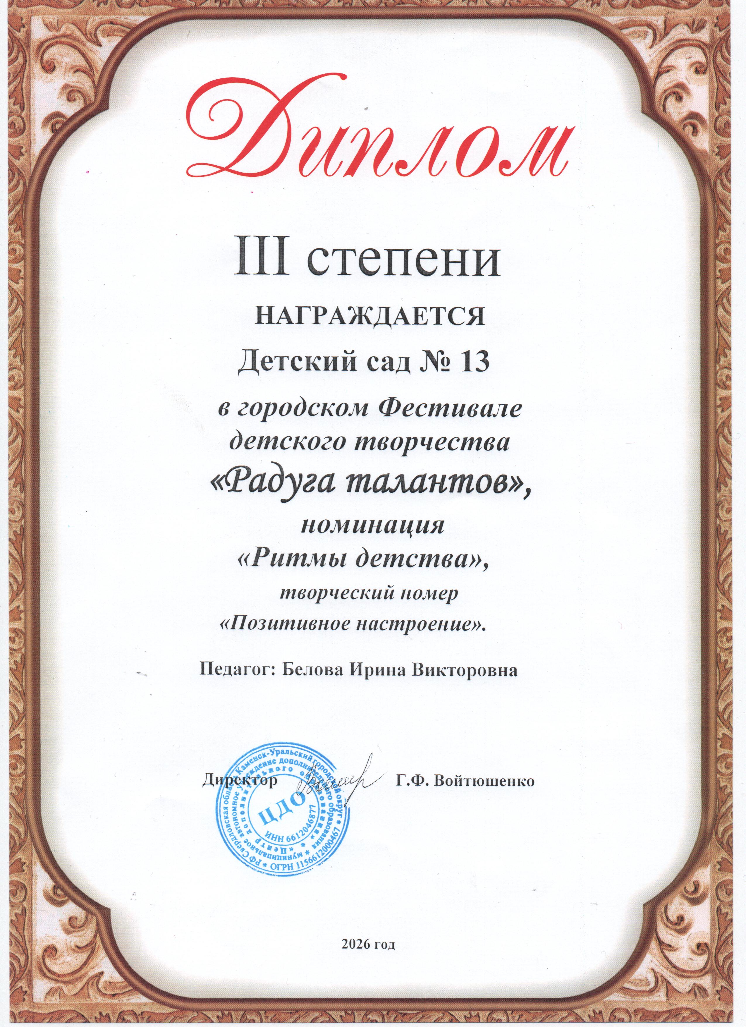 Диплом III степени в городском фестивале детского творчества "Радугр талантов", номинация "Ритмы детства", танец "Позитивное настроение"